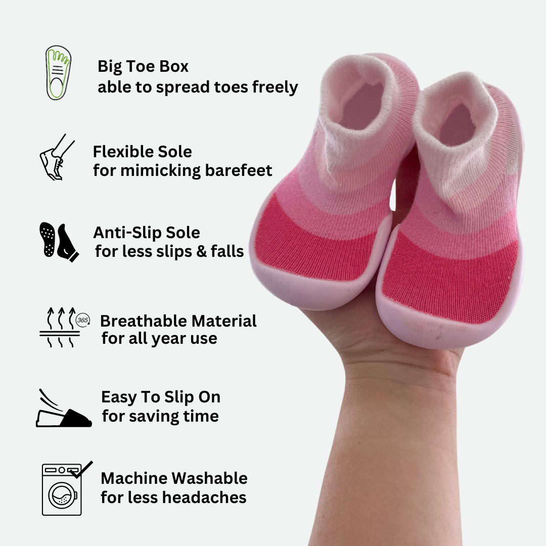 Tiny Explorings™ hugs the foot with a secure sock-style fit — no laces, no velcro battles, no shoes flying across the playground. Yet it still provides real protection with a durable, non-slip sole.